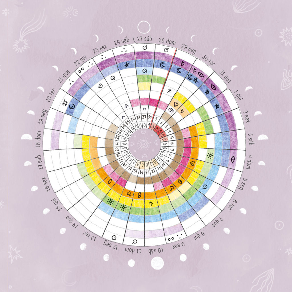 Para os diagramas vem sempre um marca-páginas desenhado para criares os teus próprios temas de autoestudo com auxílio de diferentes cores, símbolos e métodos de registo para no final de cada lunação (ciclo completo da lua, começa na Lua nova de cada mês e acaba um dia antes da próxima Lua nova) sermos capazes de visualizar um infográfico de aspetos da nossa vida durante aquele ciclo.